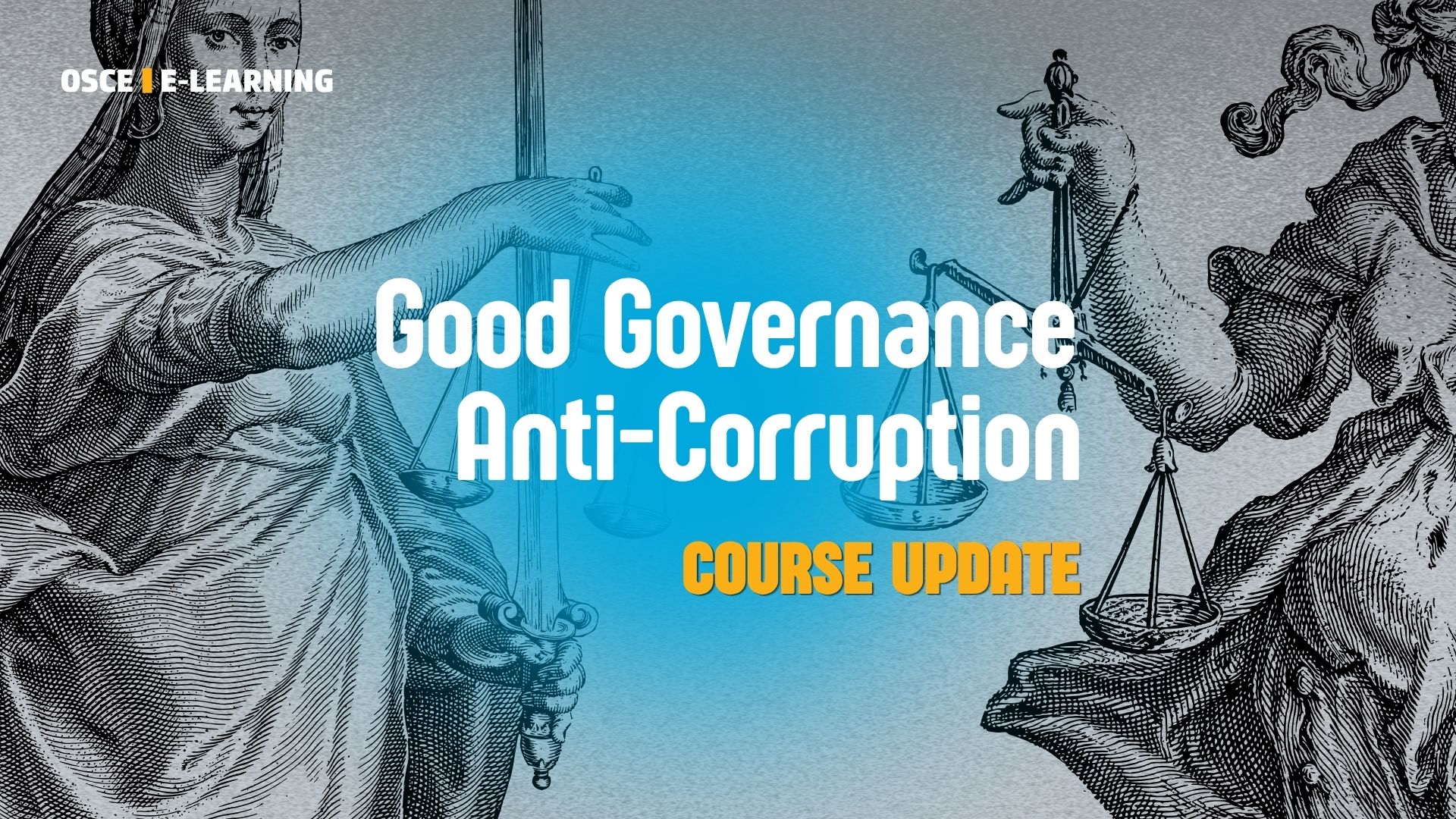 Statues of Justice with scales and sword, text stating "Good Governance Anti-Corruption Course Update" on blue background.
