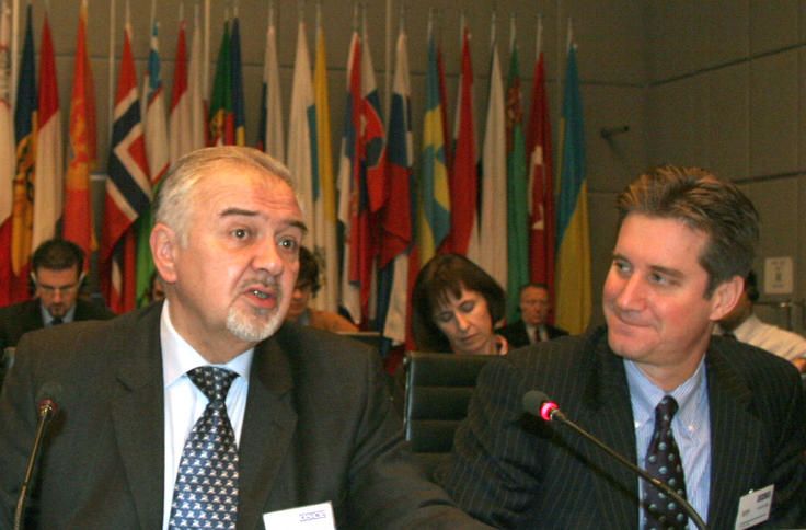 Ambassadors Yury Merzlyakov of Russia (left) and Matthew Bryza of the United States, two of the three Co-Chairmen of the Minsk Group, present a joint statement on Nagorno-Karabakh to the OSCE Permanent Council, 16 November 2006.