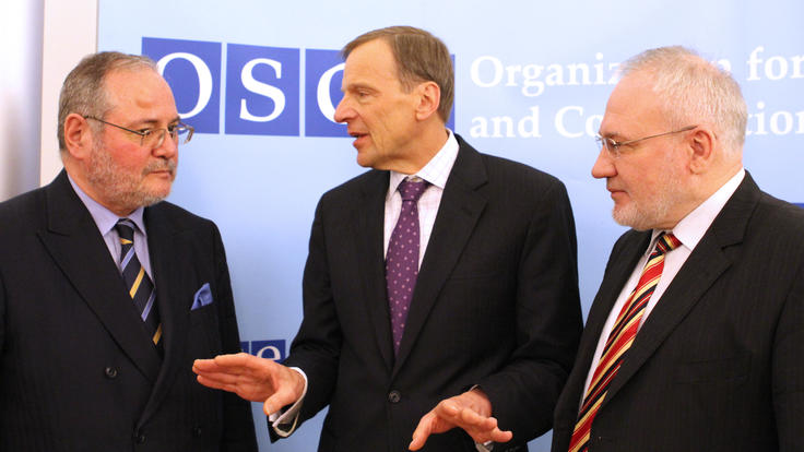 L-r: The Co-Chairs of the OSCE Minsk Group, Ambassadors Jacques Faure of France, Robert Bradtke of the United States, and Igor Popov of the Russian Federation, after their address to the OSCE Permanent Council, Vienna, 22 March 2012.