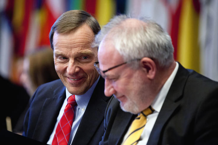 Two of the Co-Chairs of the OSCE Minsk Group, Ambassadors Robert Bradtke (l) of the United States and Igor Popov of the Russian Federation, exchange words prior to addressing the OSCE's Permanent Council in Vienna, 8 November 2012.