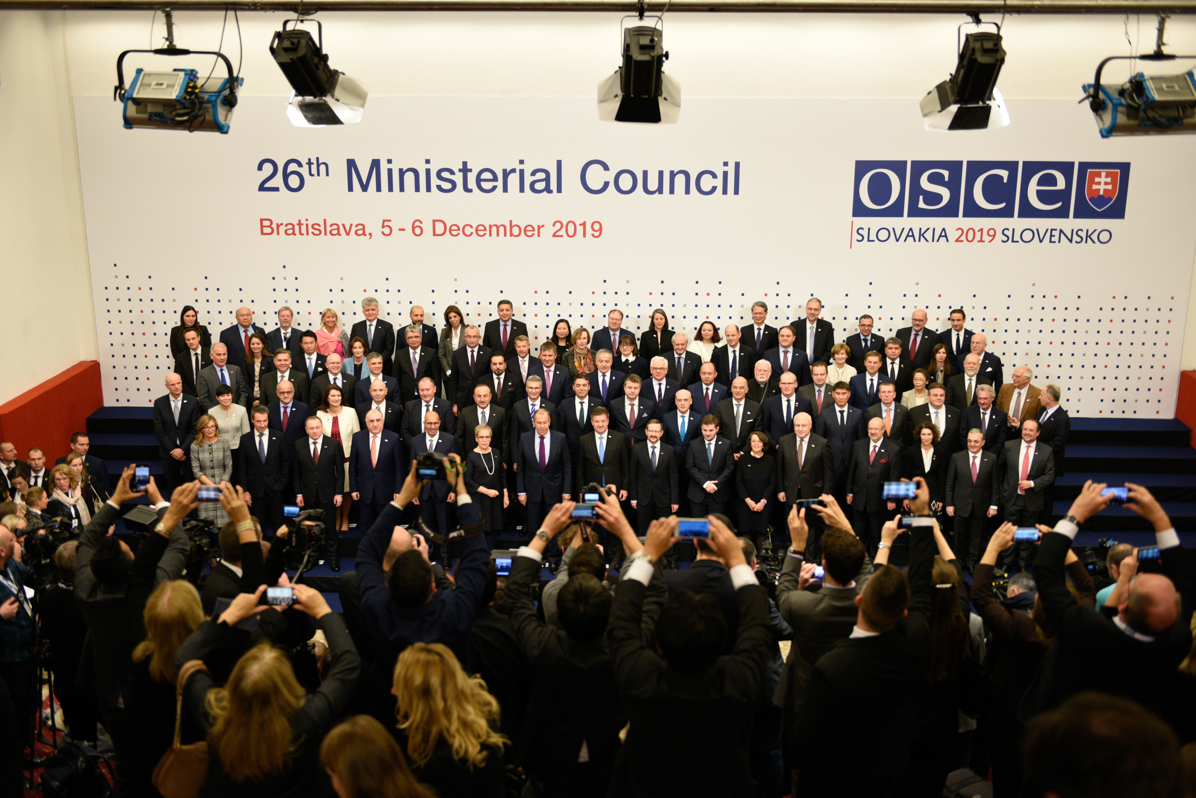 OSCE Foreign Ministers and Heads of Delegations pose for a family photo at the 26th OSCE Ministerial Council in Bratislava, 5 December 2019.