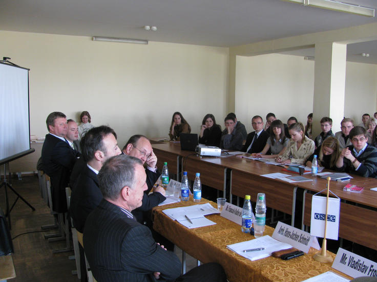 The Head of the OSCE Office in Minsk, Ambassador Hans-Jochen Schmidt (nearest camera), at an OSCE-organized conference on the future of European security, held at the Faculty of International Relations, Belarusian State University, Minsk, 29 April 2009.