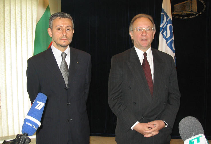 OSCE Chairman-in-Office, Solomon Passy (left), and Belarus Foreign Minister, Sergei Martynov, speak to the press in Minsk, 9 June 2004. It was the first visit of a Chairman-in-Office to Belarus in six years.