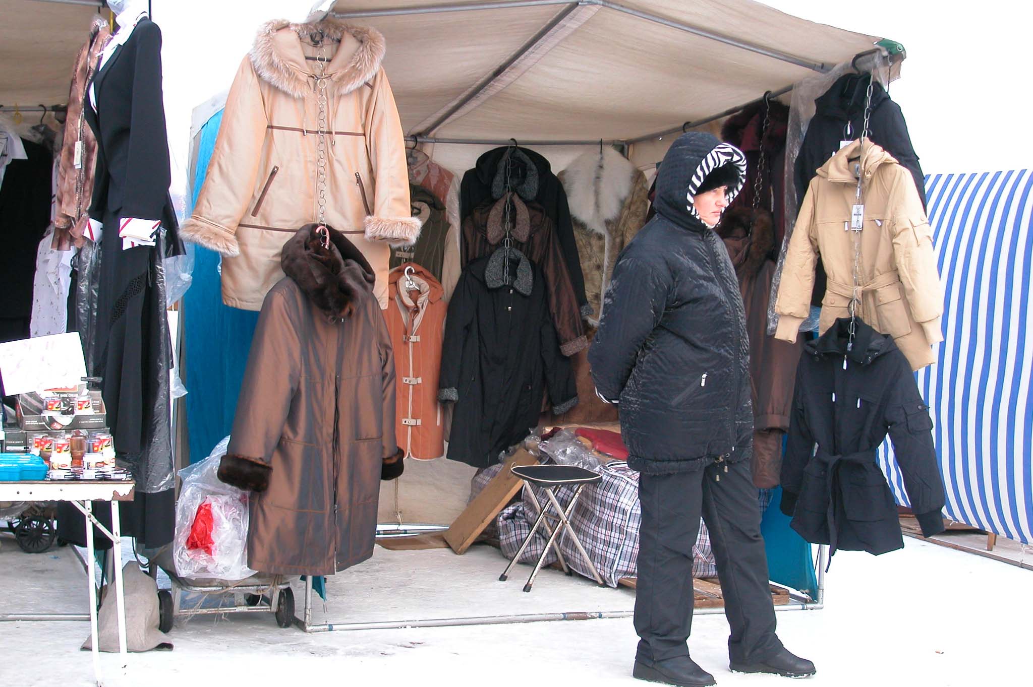 A vendor awaits customers in a clothes market in Minsk, in 2003.