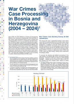 Since 2004, the OSCE Mission to Bosnia and Herzegovina (Mission) has conducted comprehensive trial monitoring of war crimes cases in Bosnia and Herzegovina (BiH). Complementing this trial monitoring, in 2014, the Mission’s War Crimes Monitoring Project (WCMP), funded by the European Union (EU), began collecting and analyzing data regarding the pre-indictment backlog of all reported potential war crimes.