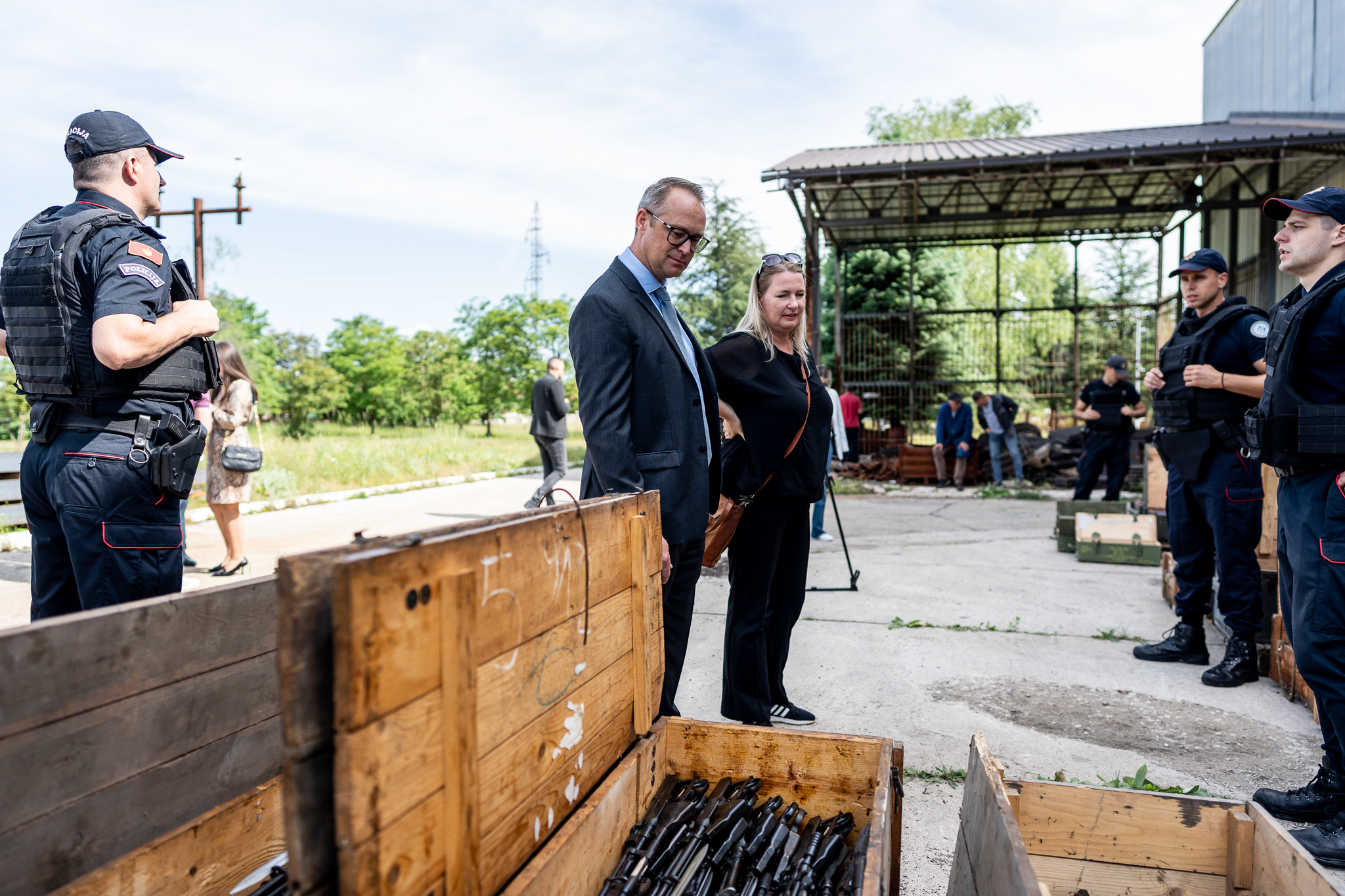 Siv-Katrine Leirtroe, Deputy Head of the OSCE Mission to Montenegro, and Johan Dahl, the Mission's Project Officer, attend the destruction of weapons, organized by the Ministry of Internal Affairs of Montenegro with UNDP/SEESAC in Nikšić, Montenegro, 7 June 2023.