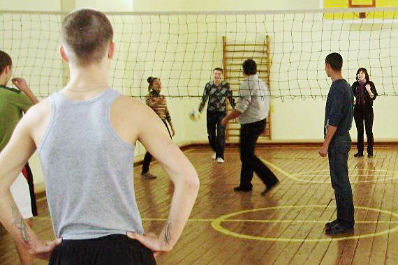 Inmates at a juvenile detention centre and visiting volunteers play a volleyball match together, Alexandrovka, 17 October 2010.
