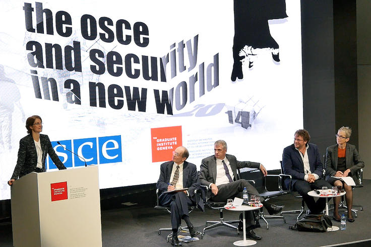 Rasa Ostrauskaite, Deputy Director of the OSCE Conflict Prevention Centre, speaking at the panel discussion "OSCE and Security in a New World" organized by the OSCE Communication and Media Relations Section and the Graduate Institute in Geneva, 1 October 2014. (Photo: Graduate Institute)