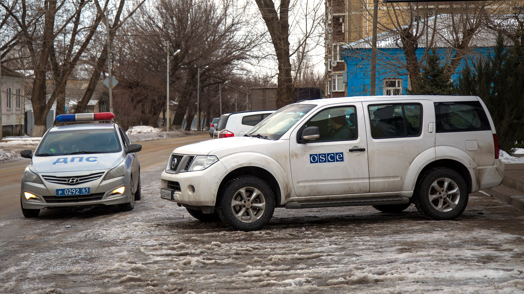 An OSCE vehicle during travel for daily shifts at the border crossing points Gukovo and Donetsk, being escorted by the Russian Federation’s police, Kamensk-Shakhtinsky, 2 February 2018.