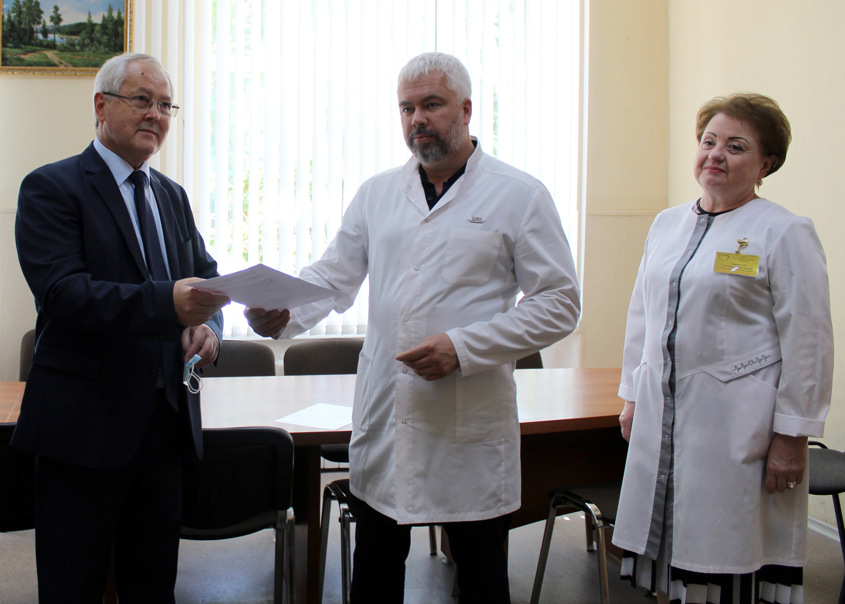 (L-r) On behalf of the OSCE, Ambassador Gyorgy Varga handed over 3,500 sets of protective clothing to Alexander Kramarenko, the Director and Ljubov Kornilova, the Head Nurse of the City Hospital, Kamensk-Sakhtinsky, 26 June 2020.