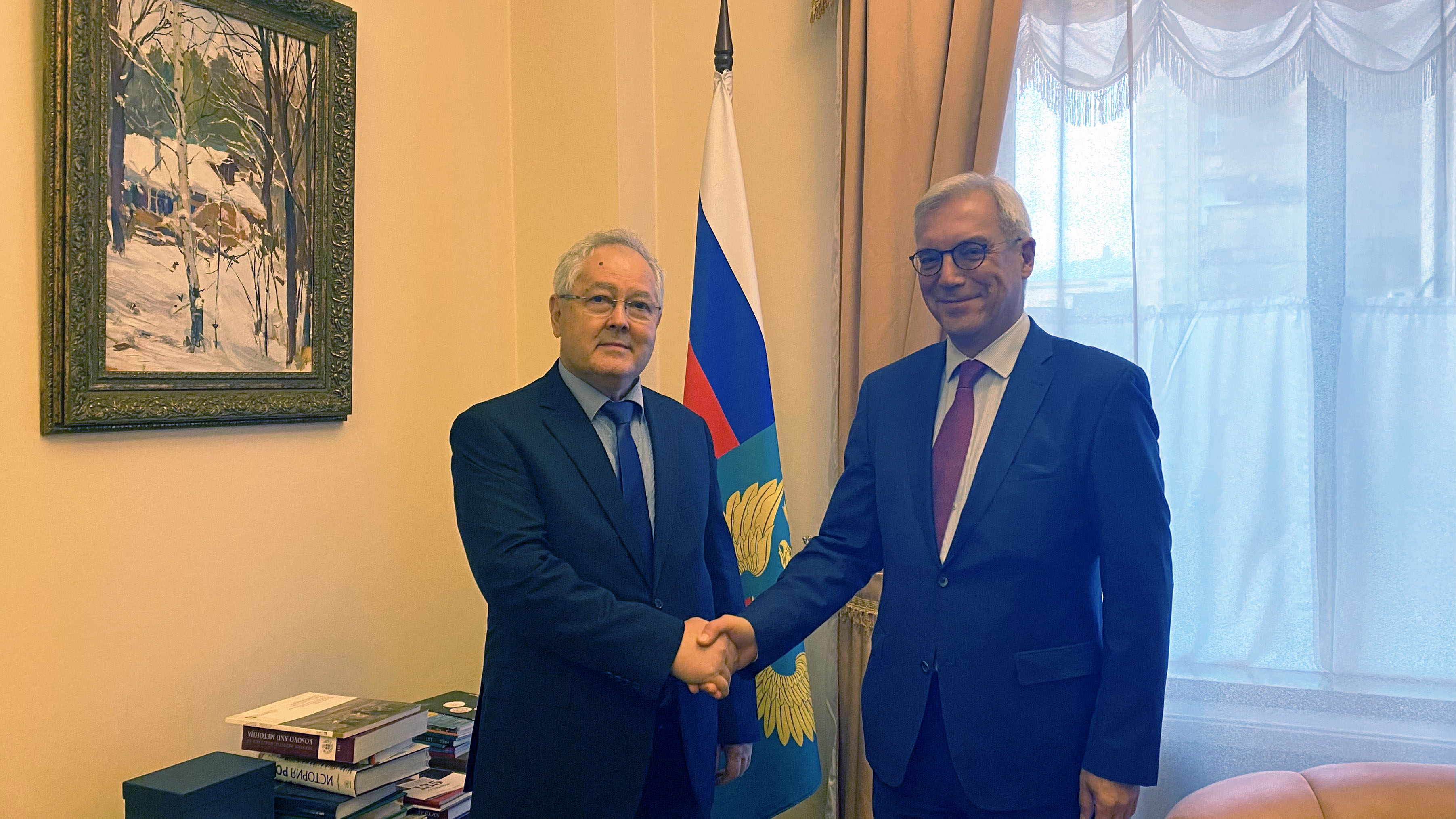 Ambassador Gyorgy Varga (l), Chief Observer of the OSCE Observer Mission at the Russian Checkpoints Gukovo and Donetsk meeting Mr. Alexander Grushko, Deputy Foreign Minister of the Russian Federation, Moscow, 27 September 2021.