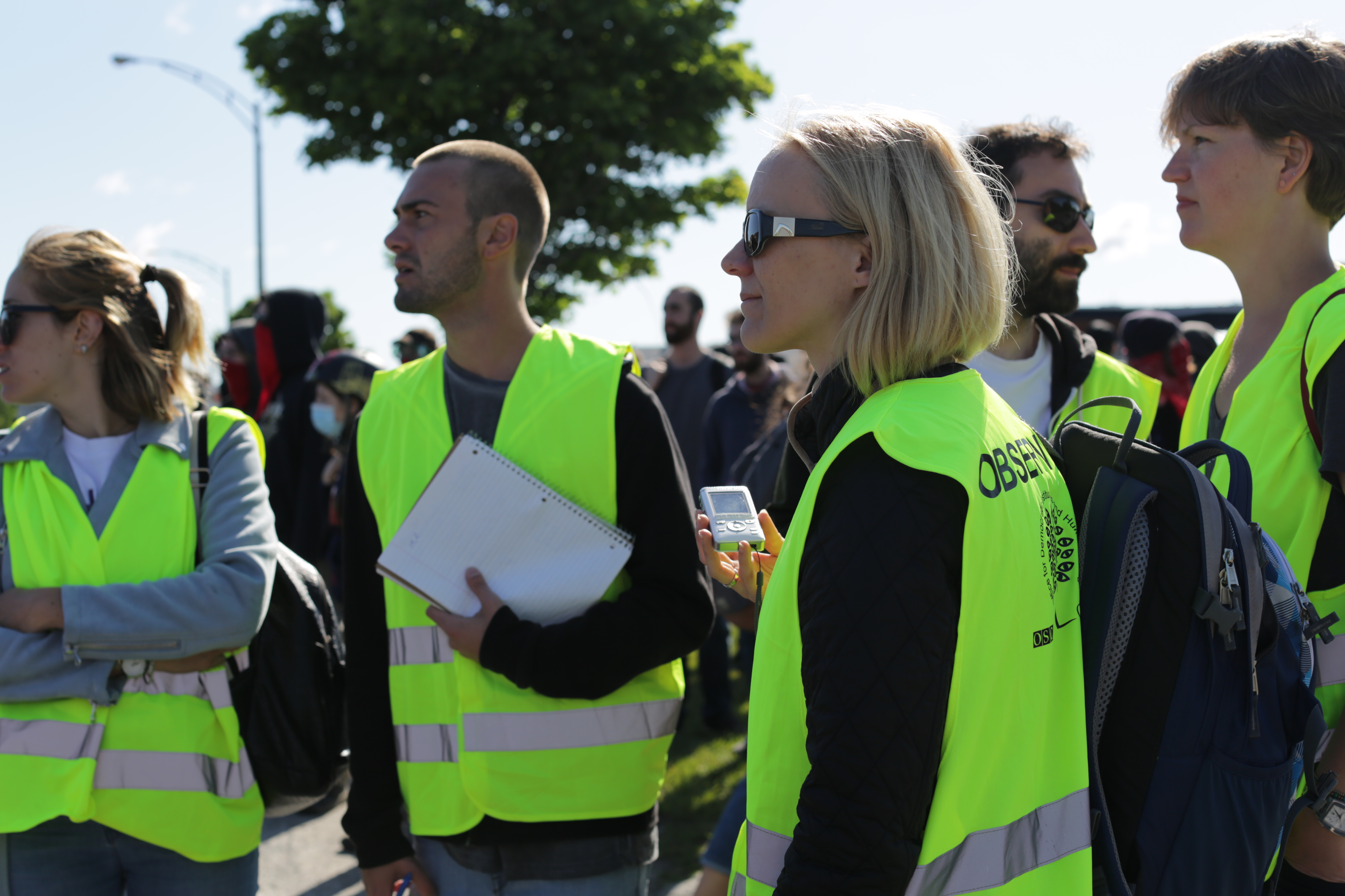 A team of monitors from the OSCE Office for Democratic Institutions and Human Rights (ODIHR) observing a public assembly during the 2018 G7 summit. Quebec City, Canada, 8 June 2018.