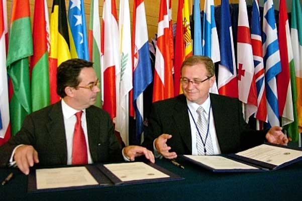 ODIHR Director Ambassador Christian Strohal (left) and Marijan Benko, Police Director General of the Croatian Interior Ministry, after signing a memorandum of understanding on fighting hate crime.