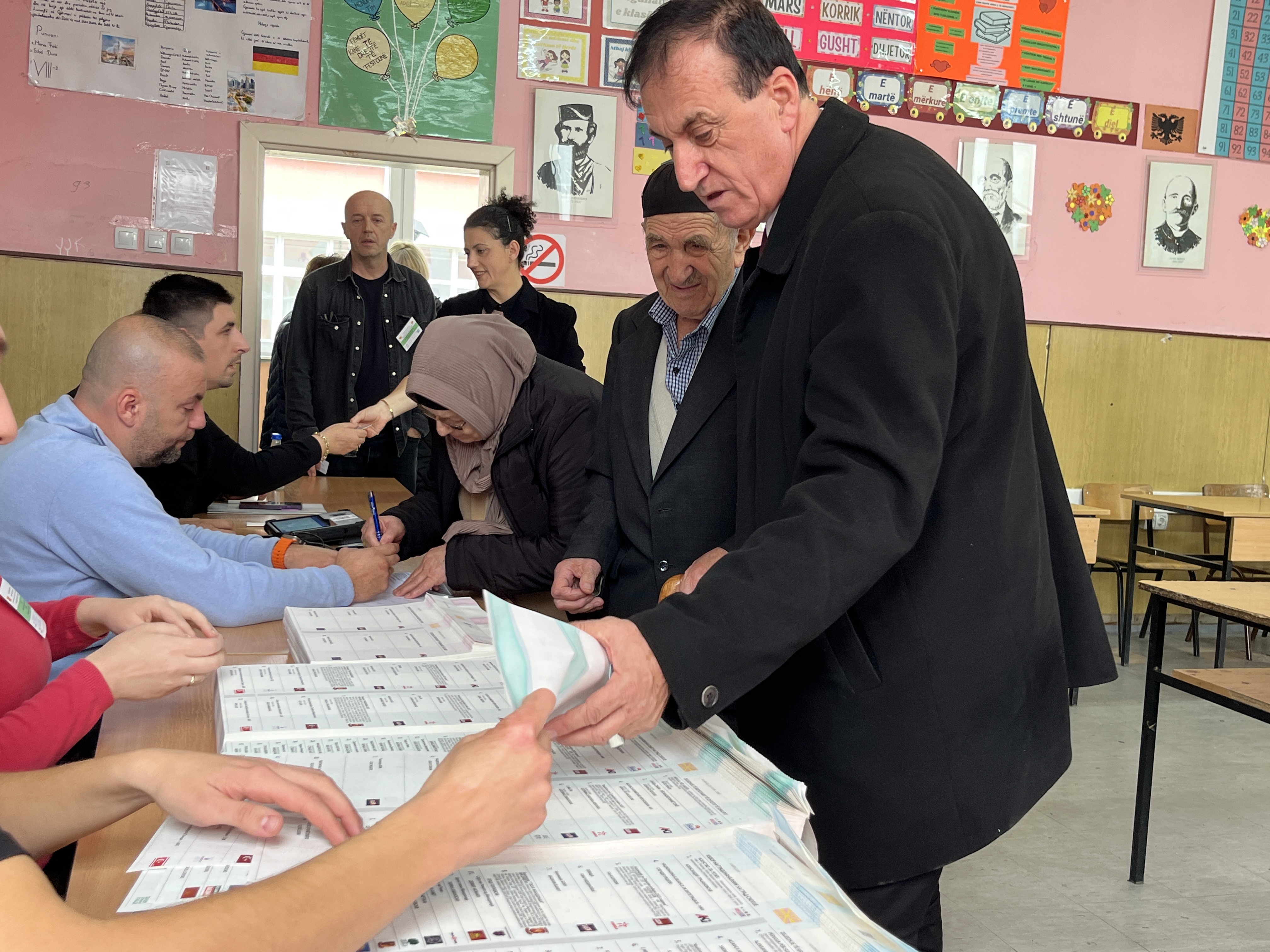 Voters check ballots and sign voter lists at a polling station during the country’s local elections. Skopje, 19 October 2025.