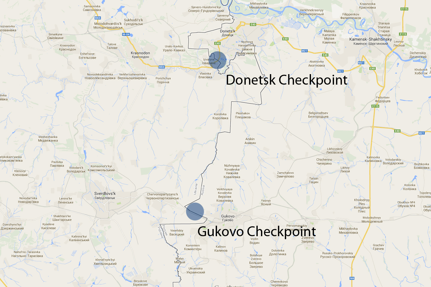 A map marked with the Russian checkpoints Gukovo and Donetsk, where OSCE Observers are stationed.