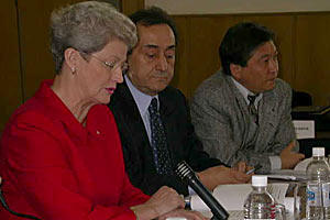 Finnish MP Paula Kokkonen, Ambassador Aydin Idil, Head of the OSCE Centre in Bishkek and A. Kakeev, Rector of the Kyrgyz National University, Bishkek, 6 December 2002.