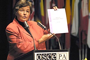 Geertje Lycklama à Nijeholt, Head of the Dutch delegation to the OSCE PA, presents the 2003 OSCE PA Gender Report to the Assembly, July 2003.