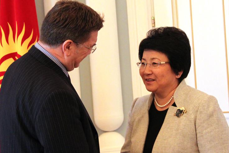 President Roza Otunbaeva of Kyrgyzstan (r) greets OSCE Parliamentary Assembly President Petros Efthymiou, Bishkek, 17 February 2011.