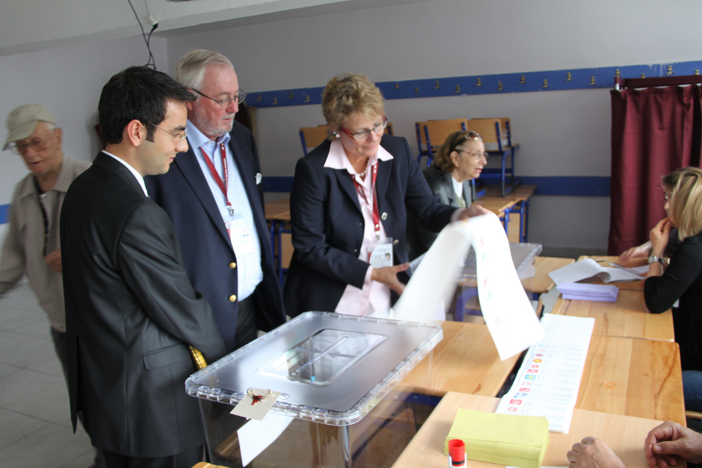 OSCE Parliamentary Assembly Secretary General Spencer Oliver and head of the delegation, Pia Christmas-Moeller (Denmark) review ballots before voting at a polling station in Ankara, 12 June 2011.