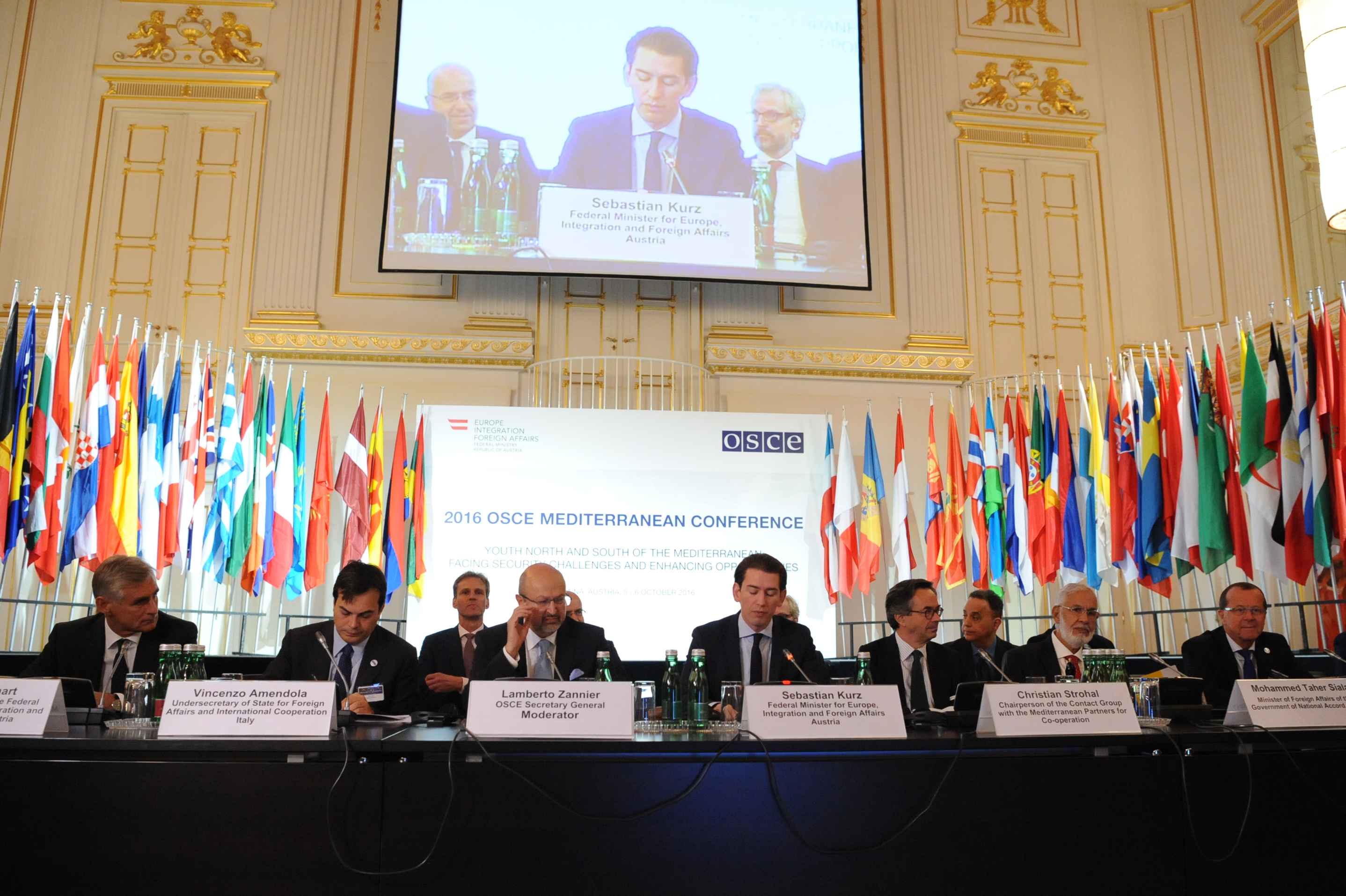 OSCE Secretary General Lamberto Zannier and Austria's Federal Minister for Europe, Integration and Foreign Affairs Sebastian Kurz at the OSCE Mediterranean Conference, Vienna, 06 October 2016.