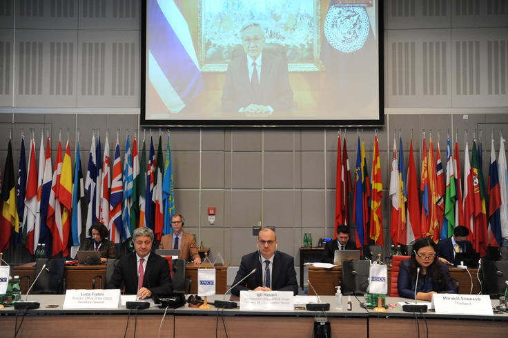 Luca Fratini Director of the Office of the Secretary General, Igli Hasani, Ambassador and Permanent Representative of Albania to the OSCE/Chairperson of the Asian Partners for Co-operation and Morakot Sriswasdi Ambassador and Permanent Representative of Thailand to the United Nations and other International Organizations in Vienna. Speaking on screen Don Pramudwinai, Deputy Prime Minister and Minister of Foreign Affairs of Thailand. Vienna, 20 September 2021