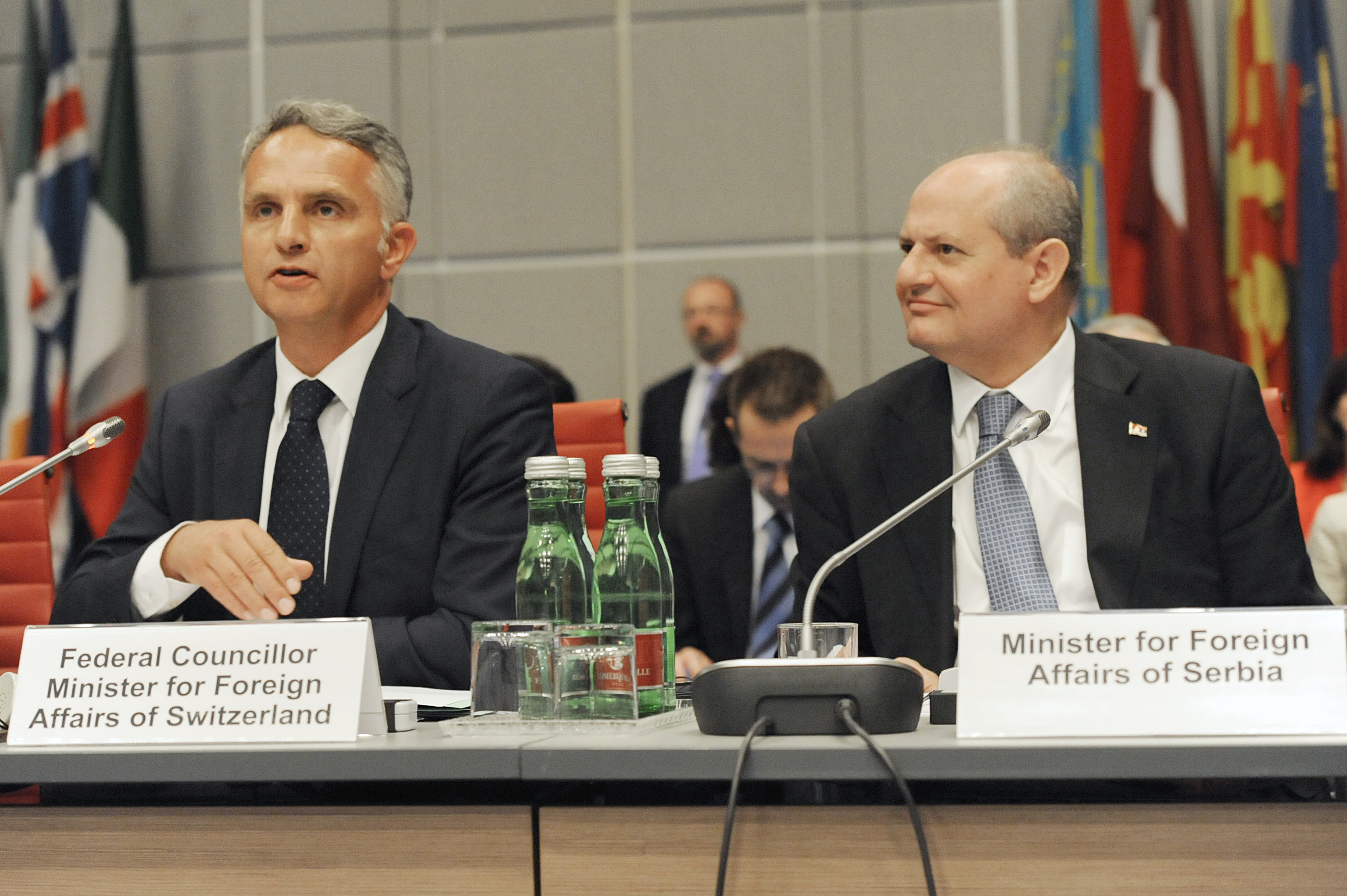 Swiss and Serbian Foreign Ministers Didier Burkhalter and Ivan Mrkić set out the priorities for their countries' Chairmanships of the OSCE in 2014 and 2015 at the OSCE Permanent Council in Vienna, 2 July 2013.