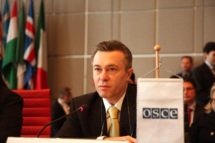 Romanian Foreign Minister Cristian Diaconescu delivers a speech to the OSCE's Permanent Council on 30 April 2009 in Vienna.