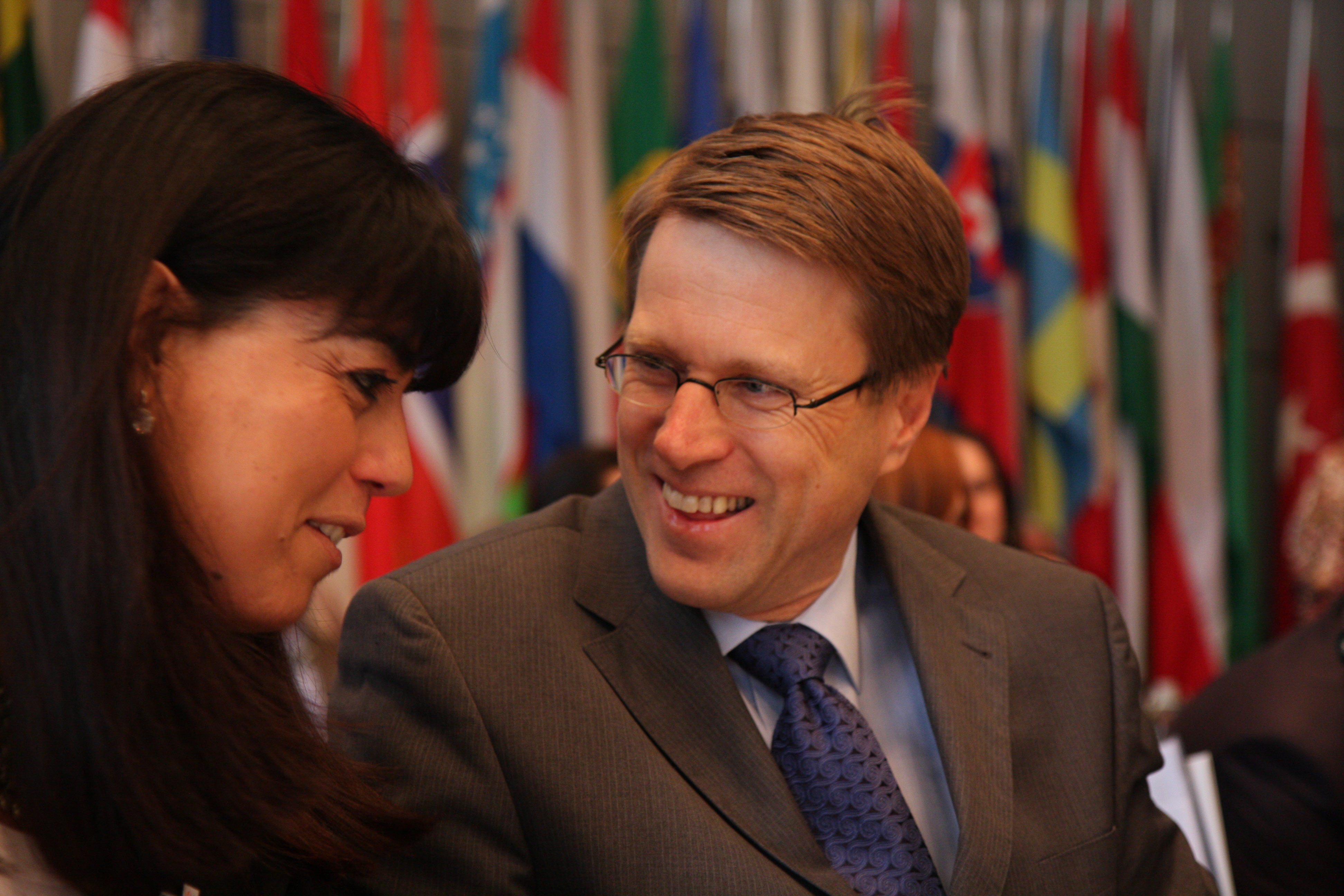 Greek Ambassador Mara Marinaki, Chairperson of the OSCE Permanent Council, and Slovene Foreign Minister Samuel Zbogar, Chairperson of the Committee of Ministers of the Council of Europe, at the OSCE Permanent Council meeting in Vienna, 4 June 2009.