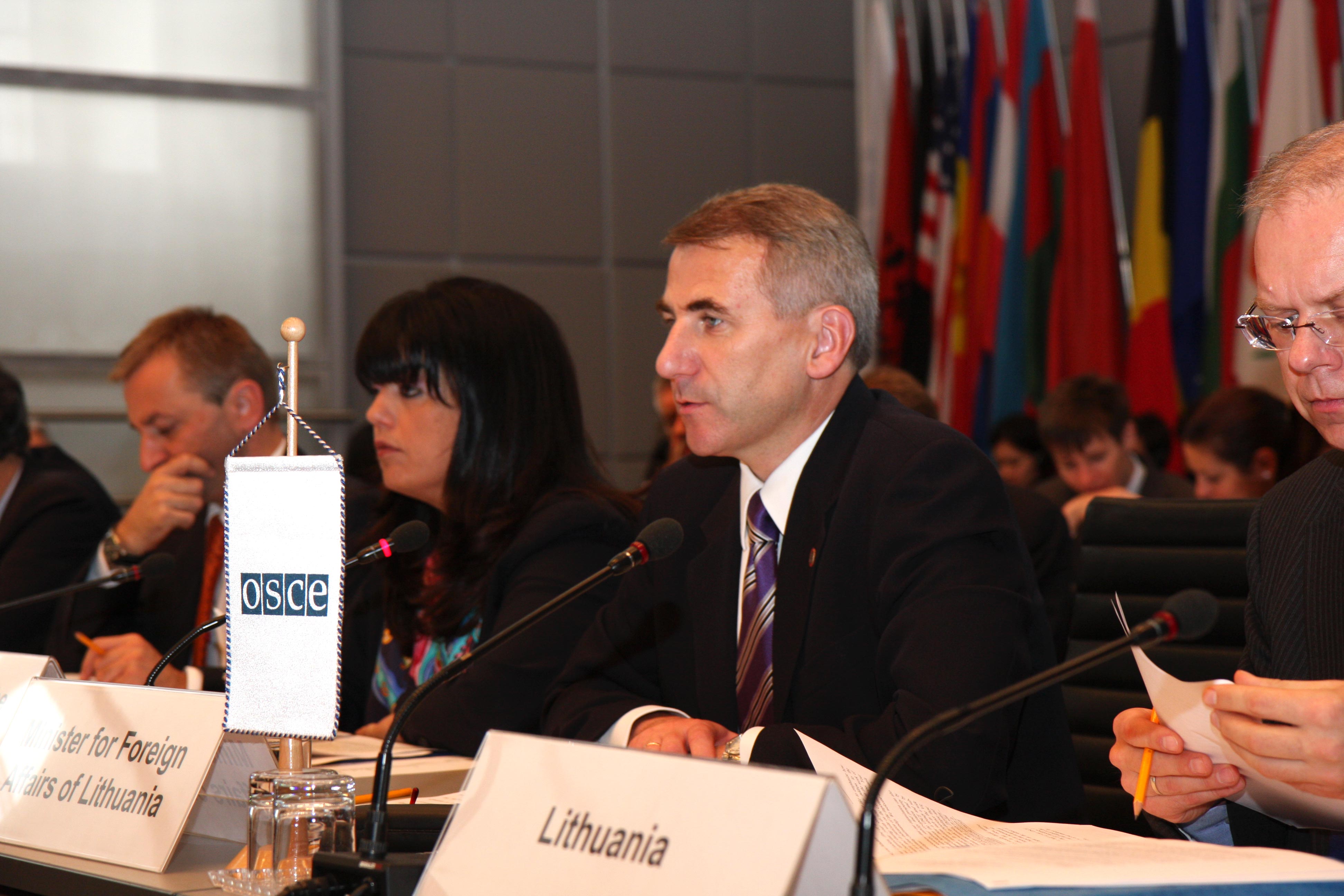 Lithuanian Foreign Minister Vyagaudas Usackas addresses the OSCE Permanent Council in Vienna, 22 October 2009.