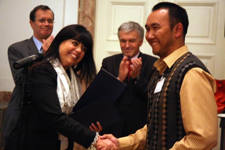 Greek Ambassador Mara Marinaki hands certificate to Kaarmanbek Kuluev of Kyrgyzstan, a winner in an OSCE video competition. Behind them are OSCE Secretary General Marc Perrin de Brichambaut and German Ambassador Heiner Horsten. Vienna, 5 November 2009.