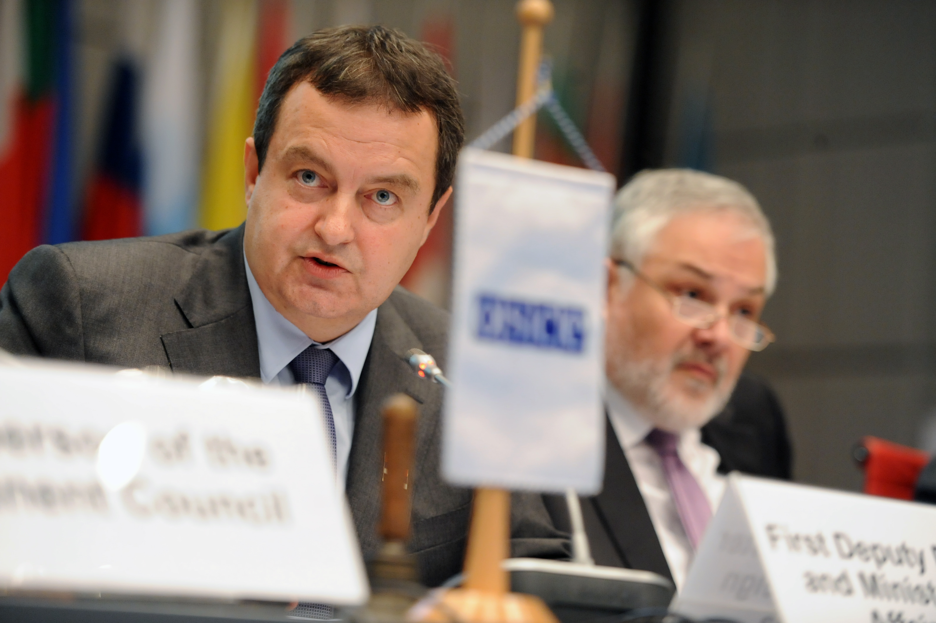The First Deputy Prime Minister and Foreign Minister of Serbia Ivica Dačić, addresses the OSCE Permanent Council, alongside Ambassador Vuk Žugić, the head of the Permanent Mission of Serbia in Vienna, 15 July 2014.