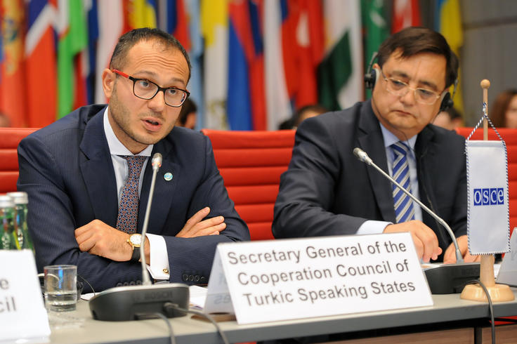 Secretary General of the Co-operation Council of Turkic Speaking States, Ramil Hasanov (l), and the Secretary General of the Parliamentary Assembly of Turkic Speaking Countries (TURKPA), Jandos Asanov (r), at the OSCE Permanent Council in Vienna, 23 July 2015.