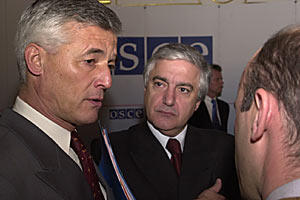 The UN High Commissioner for Human Rights, Sergio Vieira de Mello (left), talking to journalists after his speech at the OSCE Permanent Council in Vienna, 21 November 2002.