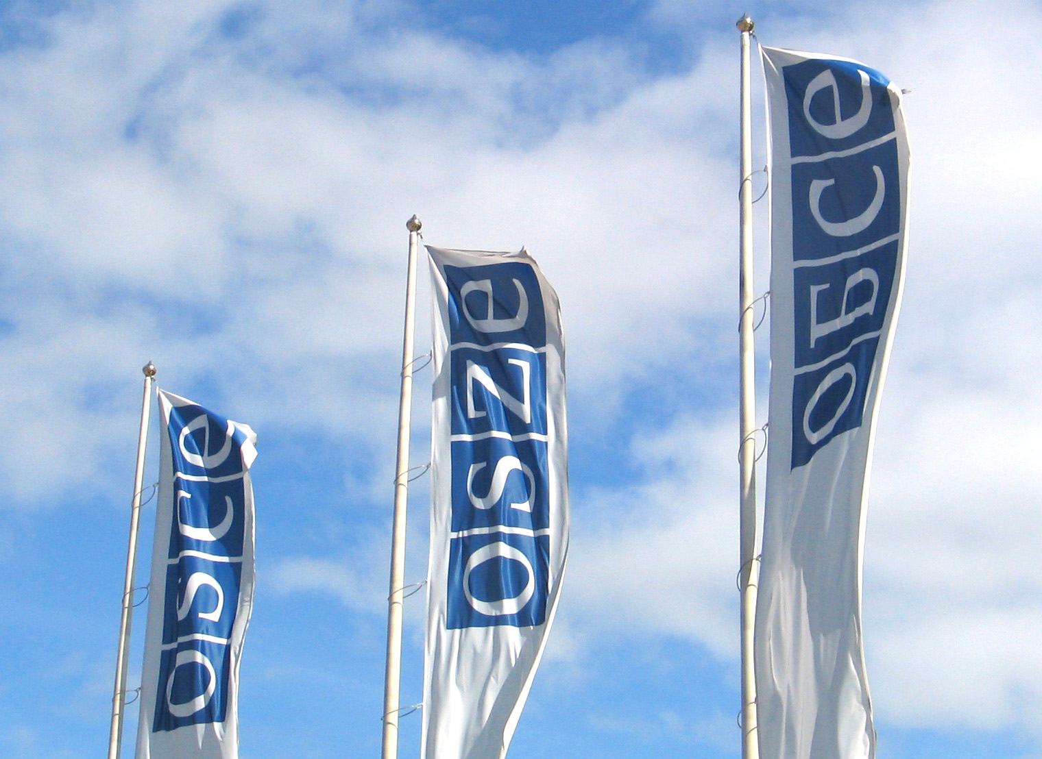 Flags with the English, German and Russian abbreviations for the Organization for Security and Co-operation in Europe in front of the Hofburg Congress Centre in Vienna, 10 May 2004.