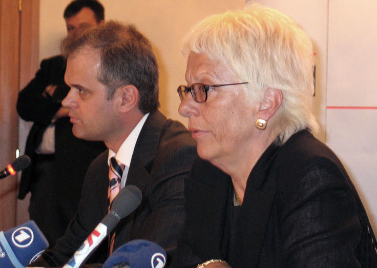 Chief Prosecutor of the International Criminal Tribunal for the former Yugoslavia, Carla Del Ponte (right), speaks at a news conference at the OSCE in Vienna, 19 May 2005.