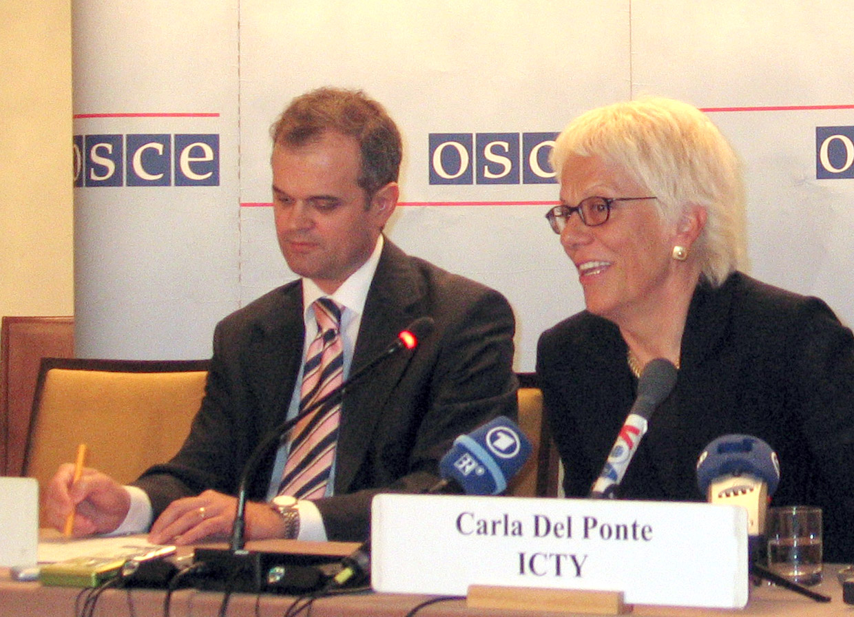 Chief Prosecutor of the International Criminal Tribunal for the former Yugoslavia, Carla Del Ponte, speaks at a news conference at the OSCE in Vienna, 19 May 2005.