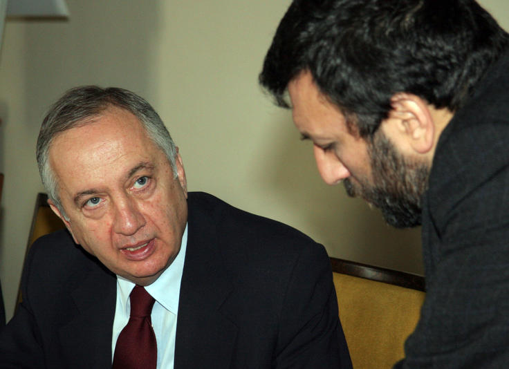 Former Turkish Ambassador to the OSCE, Omur Orhun (left), the OSCE Chairman-in-Office's Personal Representative on combating intolerance and discrimination against Muslims, speaks to a journalist in Vienna, 17 November 2005.