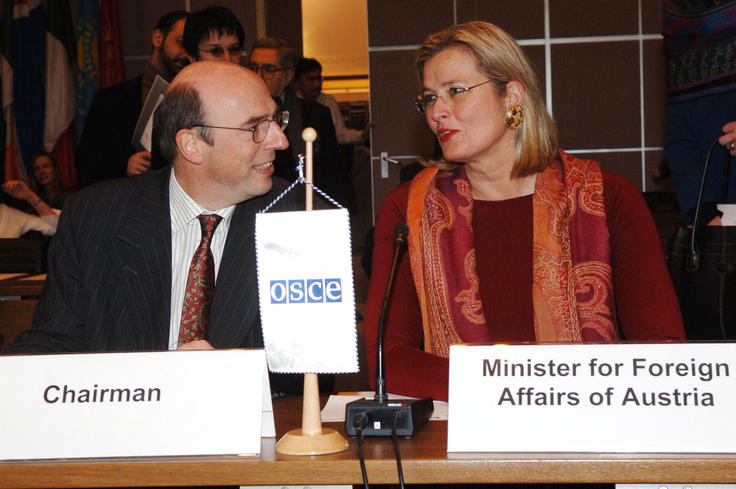 Austrian Foreign Minister Ursula Plassnik with the Chairman of the Permanent Council, Ambassador Bertrand de Crombrugghe.