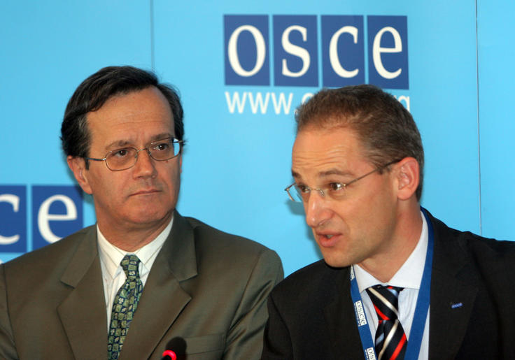 OSCE Secretary General Marc Perrin de Brichambaut (left) and the Organization's Spokesperson Martin Nesirky at a news conference at the Hofburg in Vienna, 27 October 2006.