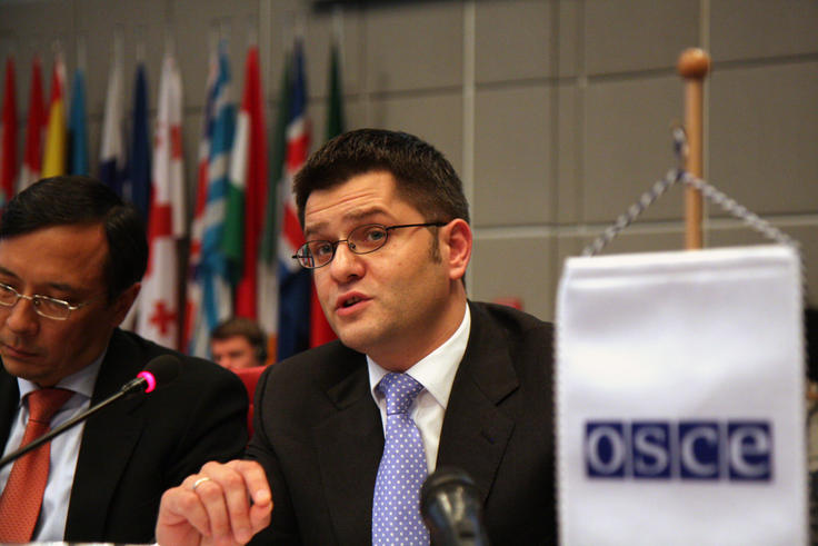 Serbian Foreign Minister Vuk Jeremic speaks to the OSCE Permanent Council. Vienna, 21 June 2010.