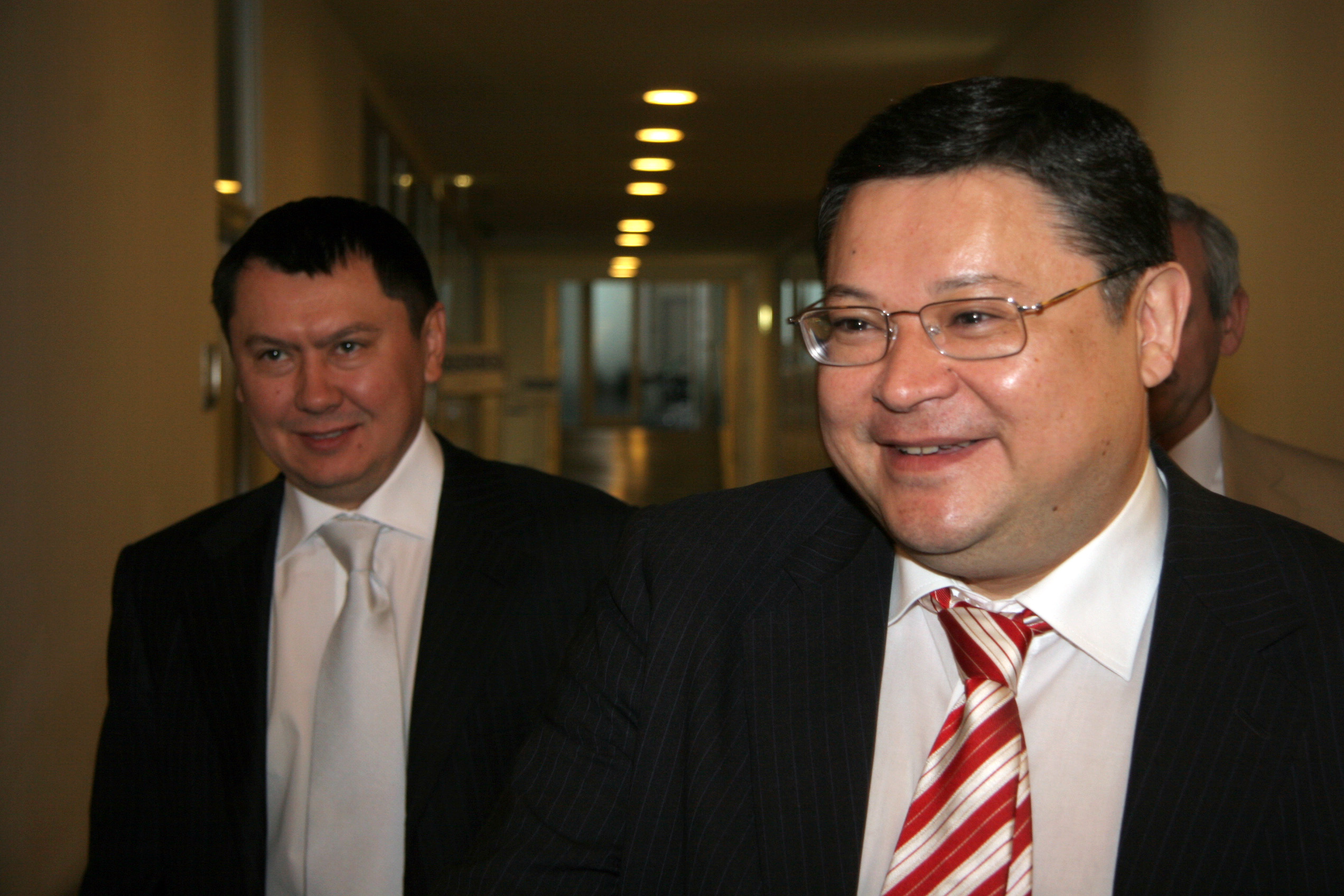 Kazakh Foreign Minister Marat Tazhin (right) with Ambassador Rakhat Aliyev before speaking to the OSCE Permanent Council in Vienna, 30 April 2007.