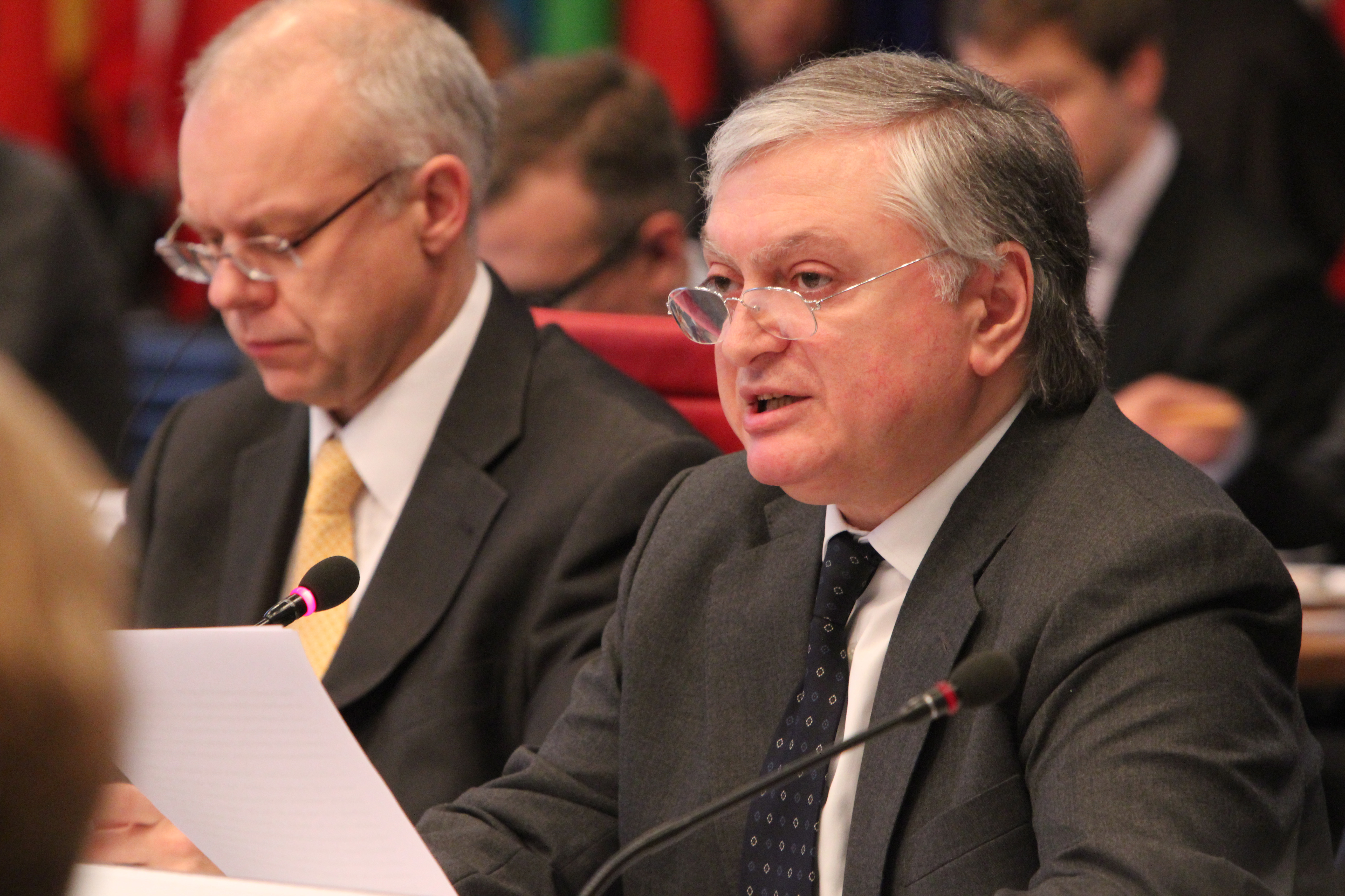 Armenian Foreign Minister Edward Nalbandyan (r) addresses the OSCE Permanent Council next to Lithuania's Permanent Representative to the OSCE, Ambassador Renatas Norkus, Vienna, 3 March 2011.