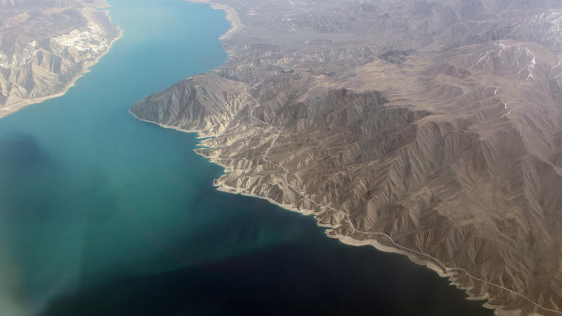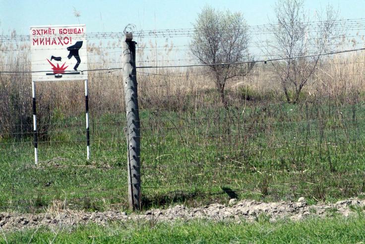 A sign warning of the presence of landmines at the Afghan-Tajik border near Pyanj, Tajikistan, 6 April 2011.
