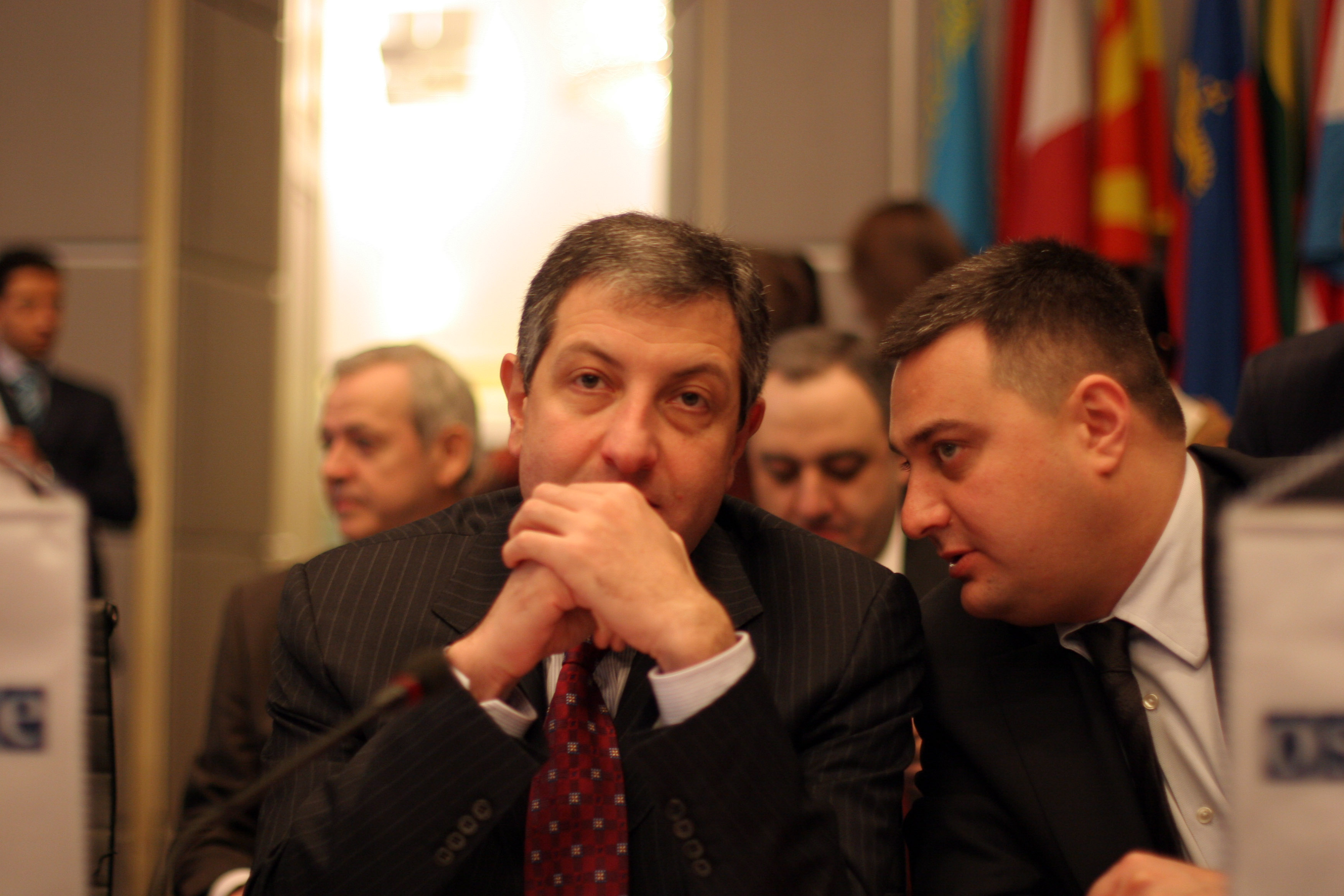Georgian Prime Minister Zurab Nogaideli listens to Ambassador Victor Dolidze (right) before the start of the Permanent Council at the OSCE in Vienna, 30 October 2007.