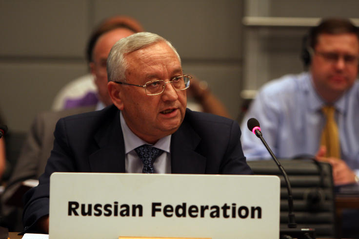 Russian Ambassador to the OSCE, Anvar Azimov, addresses a special meeting of the OSCE's Permanent Council, in Vienna 28 August 2008.