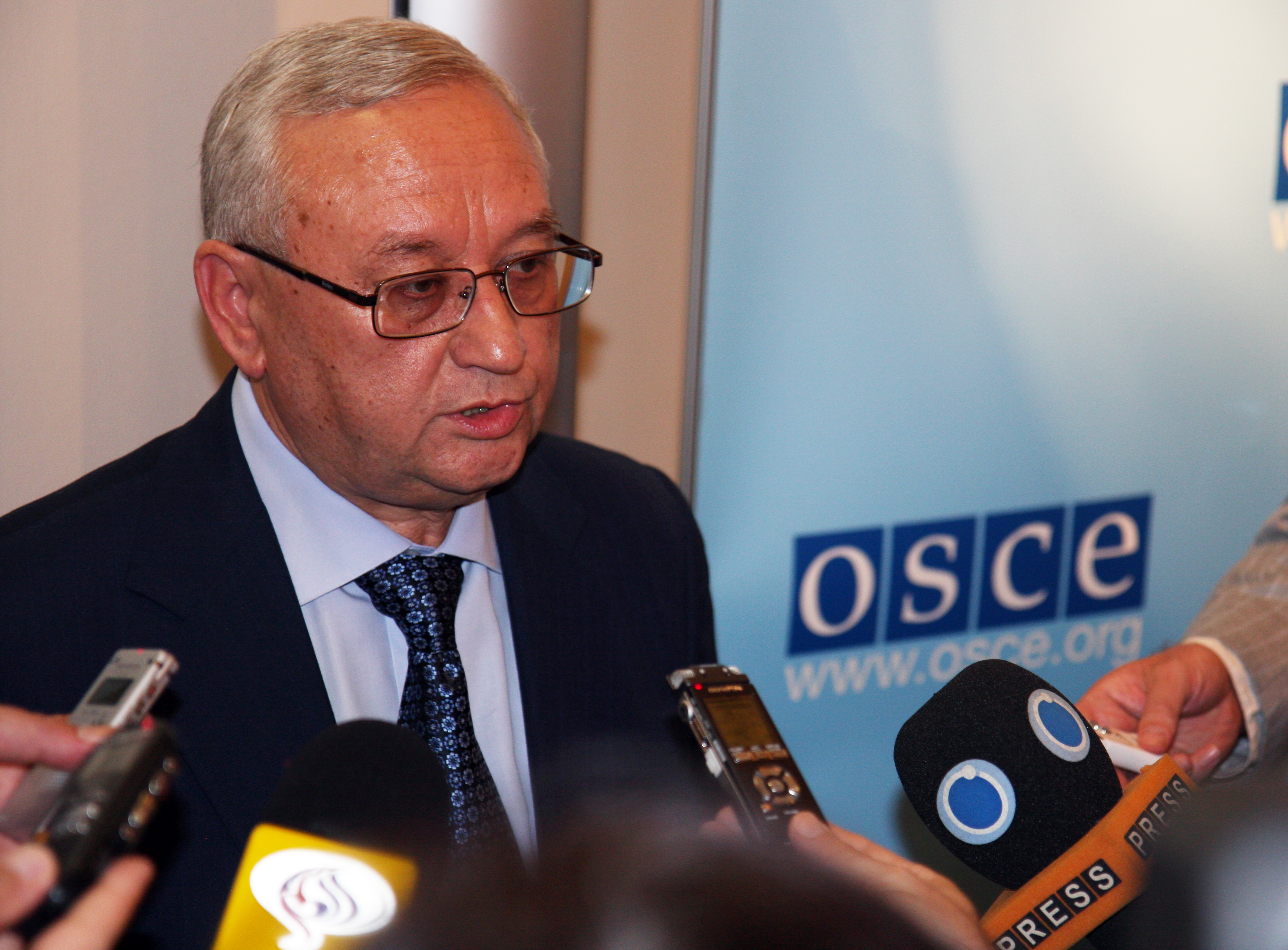 Russian Ambassador to the OSCE, Anvar Azimov, speaking to journalists after a special meeting of the OSCE's Permanent Council, in Vienna 28 August 2008.