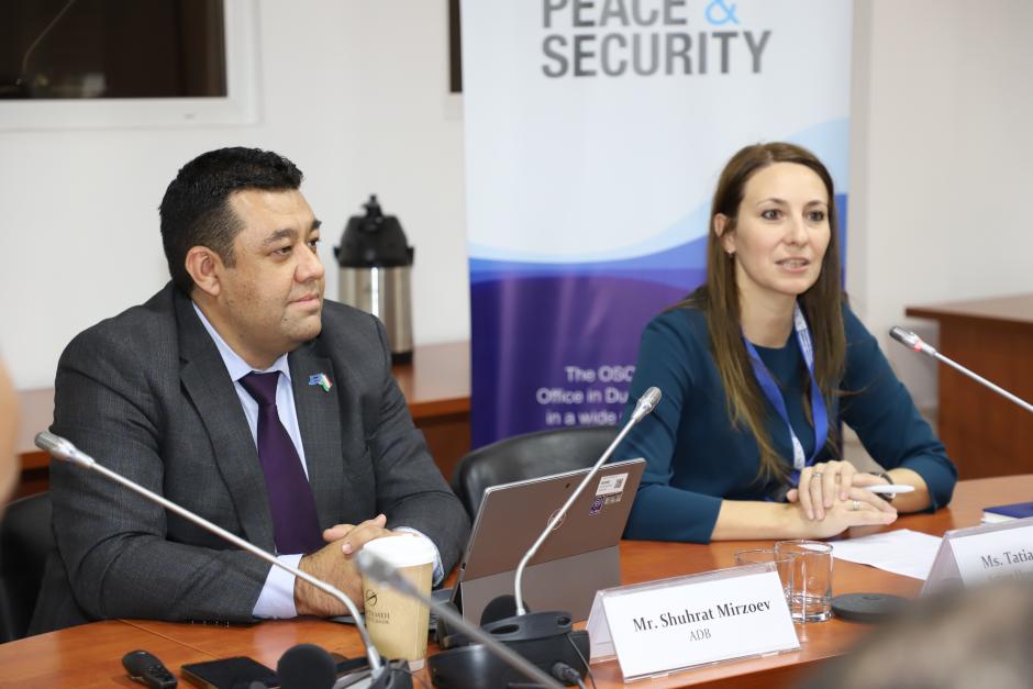 (left-right) Shuhrat Mirzoev, Senior Economics Officer at Asian Development Bank Tajikistan, and Tatiana Turcan, Acting Head of the OSCE Programme Office in Dushanbe, welcome participants to the concluding Development Co-ordination Council Working Group meeting on economic and trade development, Dushanbe, 7 October 2025.