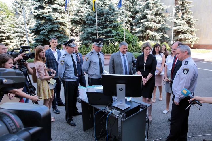 (l-r) First Deputy Chief of the National Police of Ukraine, Vyacheslav Abroskin; Chief of the National Police, Serhii Kniaziev; Minister of Internal Affairs of Ukraine, Arsen Avakov; British Ambassador to Ukraine, Judith Gough; Senior Project Officer of the OSCE Project Co-ordinator in Ukraine, Jeffrey Erlich; Chief of the Department of Cyber Police, Serhii Demediuk overview modern specialized equipment for donation to face current cyber threats. Kyiv, 19 July 2017.