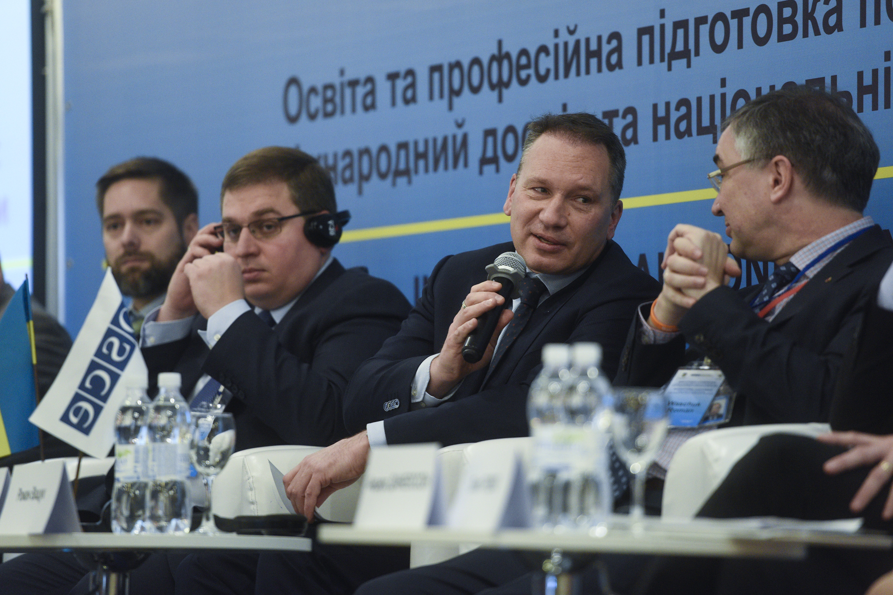 Christopher Smith(l), INL Director US Embassy, Oleksiy Takhtay, State Secretary of the Ministry of Internal Affairs of Ukraine, Ambassador Vaidotas Verba, OSCE Project Co-ordinator in Ukraine, Ambassador Roman Waschuk, Embassy of Canada in Ukraine speaking at the International Conference on “Police Education and Training: International Experience and National Perspective”, Kyiv, 11 December 2017.