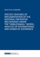 Series of publications “National preventive mechanism Library” includes number of research studies in the area of the national preventive mechanism developments against torture and ill-treatment in Ukraine based on the “Ombudsman+” model. The studies developed in the frame of long-standing project co-operation between OSCE Project Co-ordinator in Ukraine and the Ukrainian parliamentary commissioner for human rights The library provides overview of methodological, theoretical and practical issues of the national preventive mechanism, basic standards of proper treatment of arrested and detained persons, as well as the provisions of national legislation of Ukraine. The publications define basic steps of the detention facilities monitoring, describe situations that a monitor may face during the monitoring visit, provide recommendations on conducting interviews, as well as consideration on implementation and development of alternative mechanisms of human rights violations investigations that would ensure objectivity and transparency and make the punishment of guilty persons irreversible.